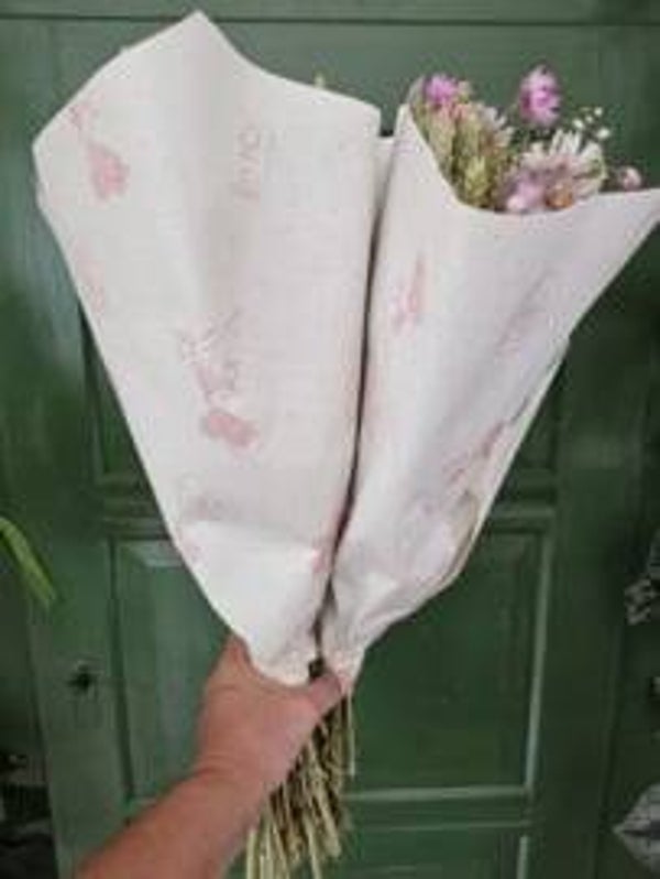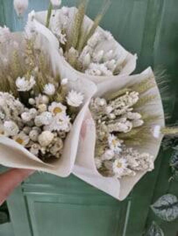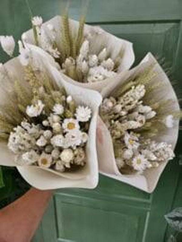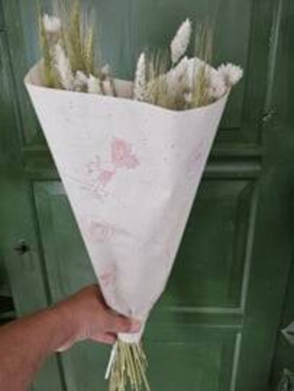 Droogbloemen boeket Belle Blance, een naturel gesorteert boeket met gedroogde bloemen, tarwe, Rhodante. Wanneer het droogboeket uit de zon blijft staat het zeker een jaar.