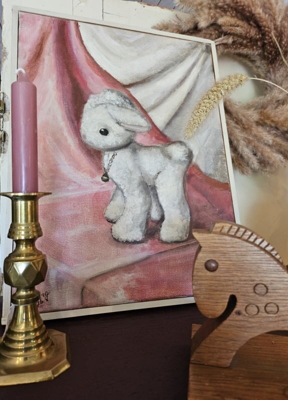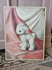Schilderij lammetje, een schattig lief tafereeltje. Geschilderd op doek.