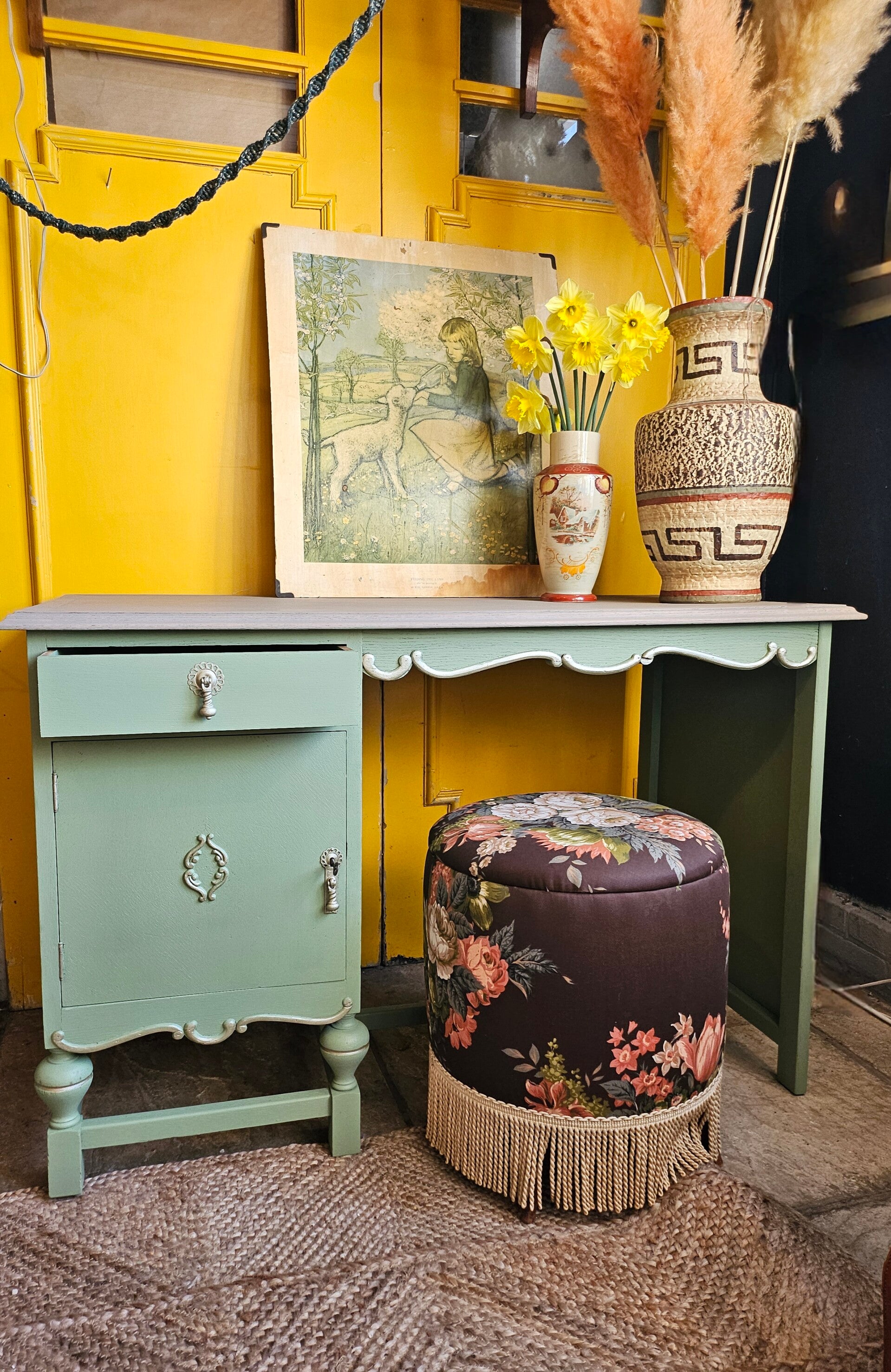 Vintage kinder bureautje, in een zeer nette staat. Geschilderd met Fusion Mineral Paint, accenten aan gezet met goud. Bureaublad heeft een Algonquin wash gekregen. Bureaublad is tevens voorzien van een tough coat.