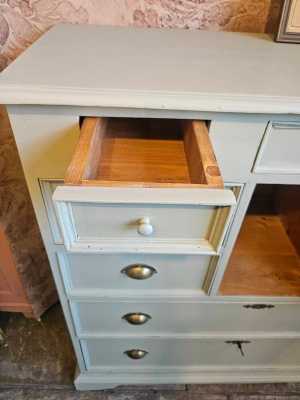 Apothekerskast. Een fris grenen ladekastje met één deurtje. Kastje is gerestaureerd en is zo ontzettend op geknapt. Uiteraard nog wel wat gebruikerssporen daar het een oud kastje betreft. Geschilderd met Eucalypthus van Fusion Mineral Paint. Orgineel beslag. Twee functionerende sleutels aanwezig.