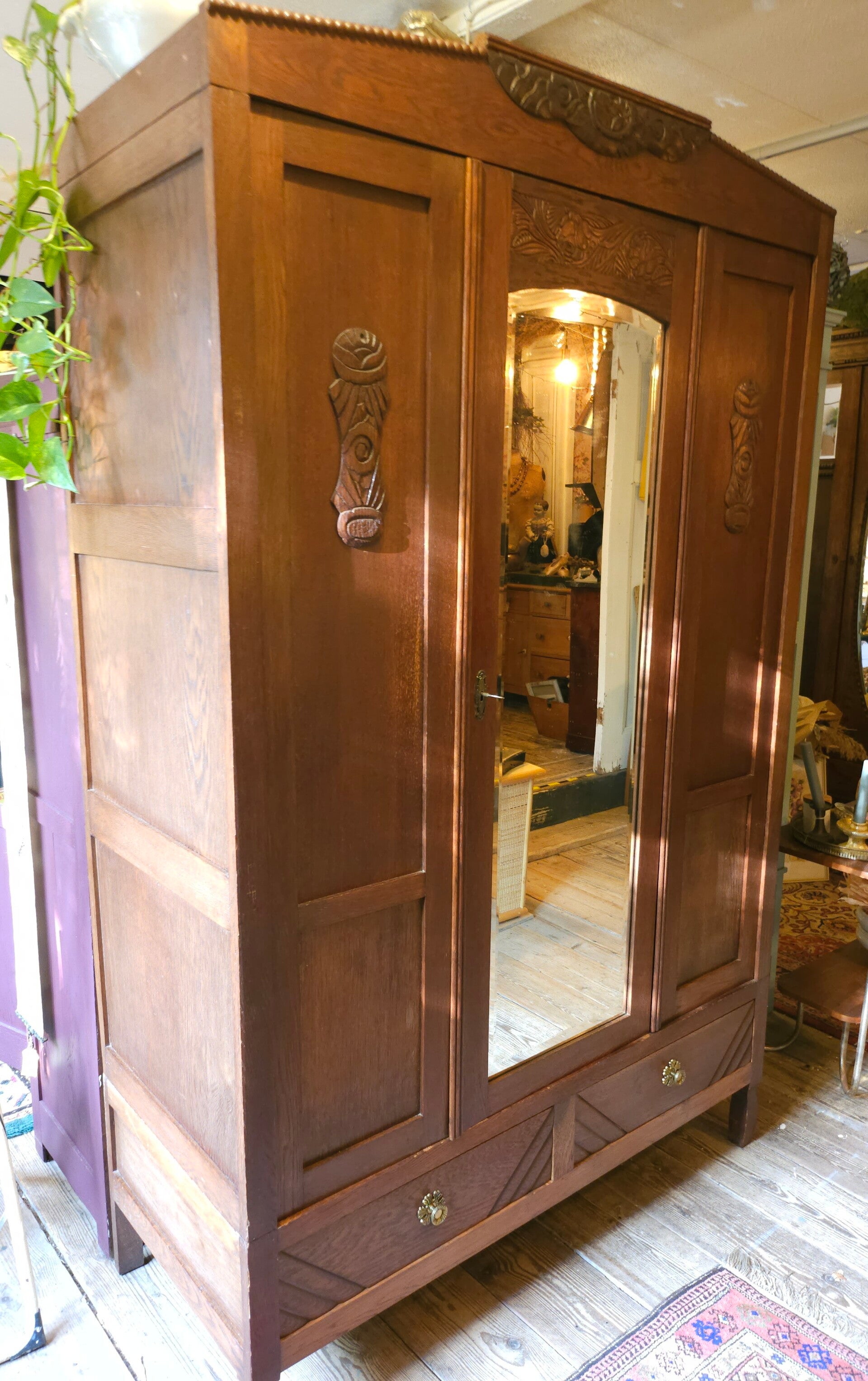 Twee deurs, het rechter paneel zit vast. In de kast een hang gedeelte. Naar eigen smaak zijn er eenvoudig planken in te demonteren. Prachtige spiegel in het facet. De kast is in een zeer nette staat. Kleine gebruikerssporen. Geen sporen van houtworm.