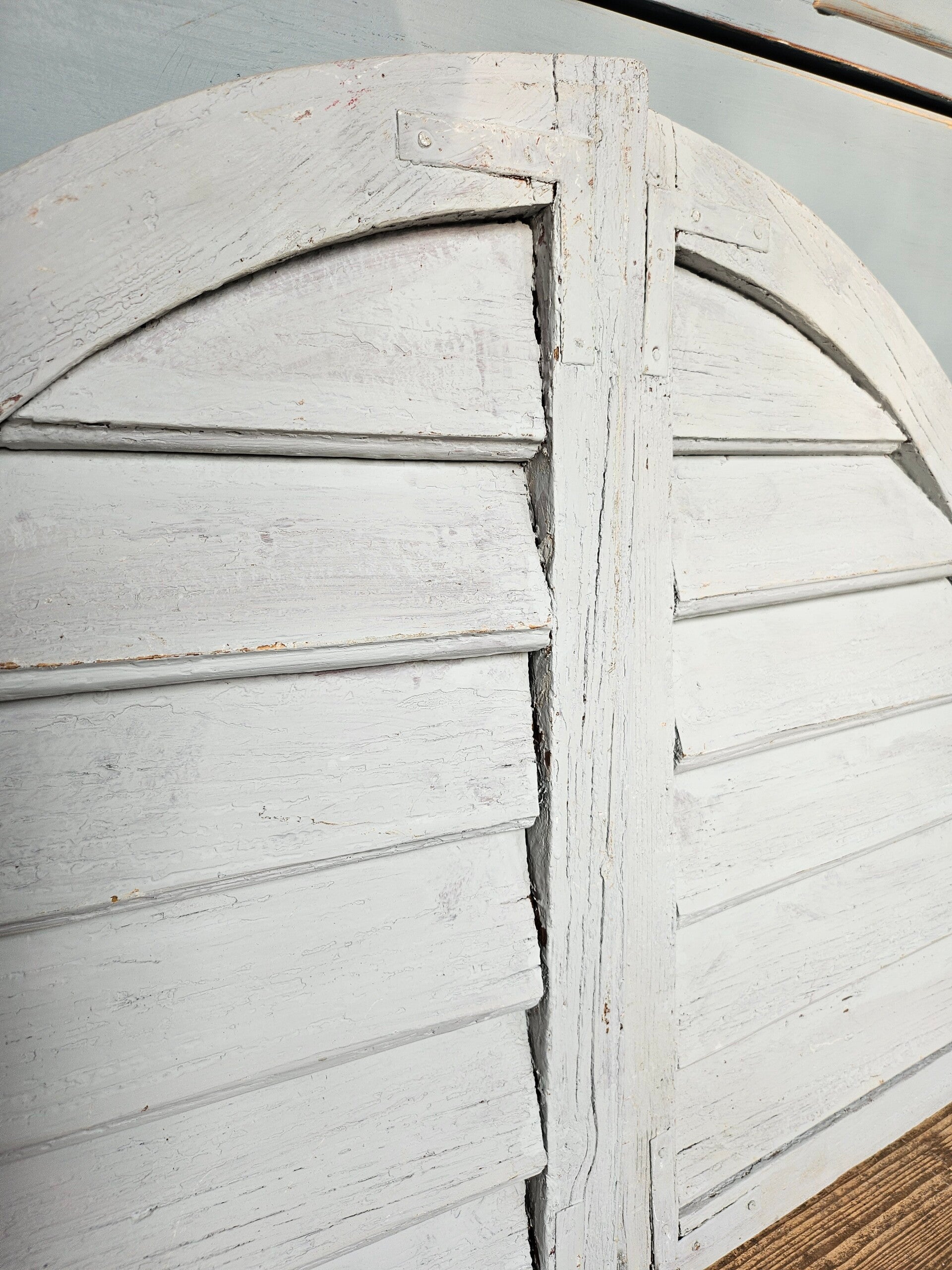 Frans brocante luiken set, orginele vergrijsde patina. Shabby geleefd, stoer en unieke set door de korte boogjes. Open of dicht neer te zetten of op te hangen.