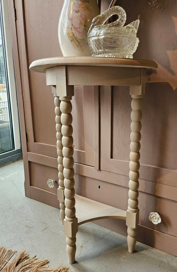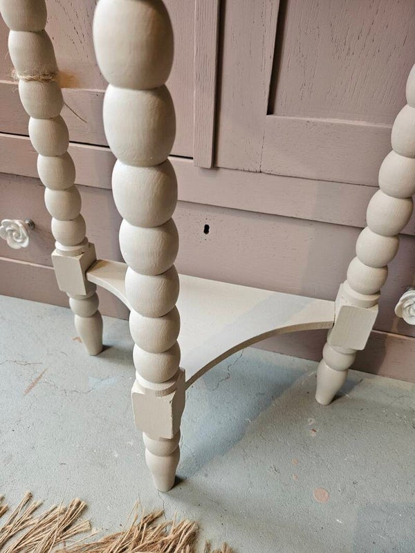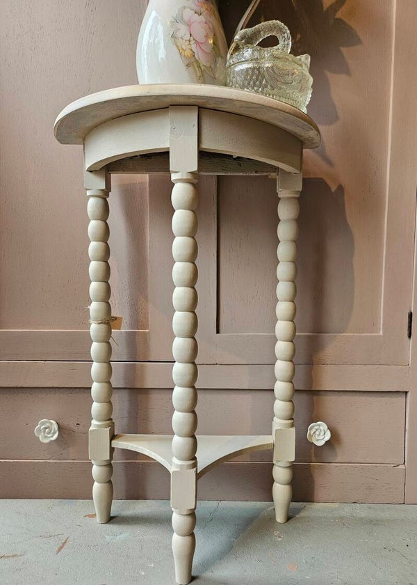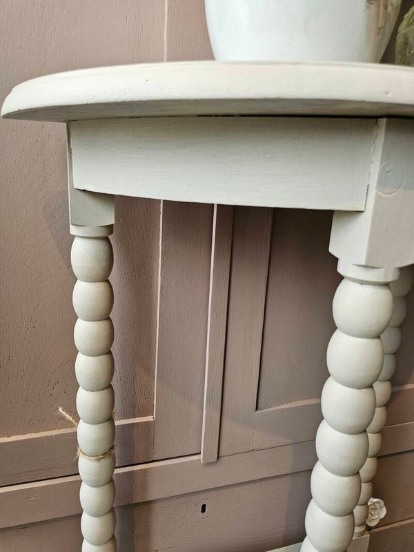 Aldwinke demilune console tafel in Cathedral Taupe van FusionMineralPaint. Deze tafel heeft een half ronde vorm en is perfect voor in de hal of woonkamer. De tafel is in goede staat en heeft een unieke uitstraling door de bobbin poten.