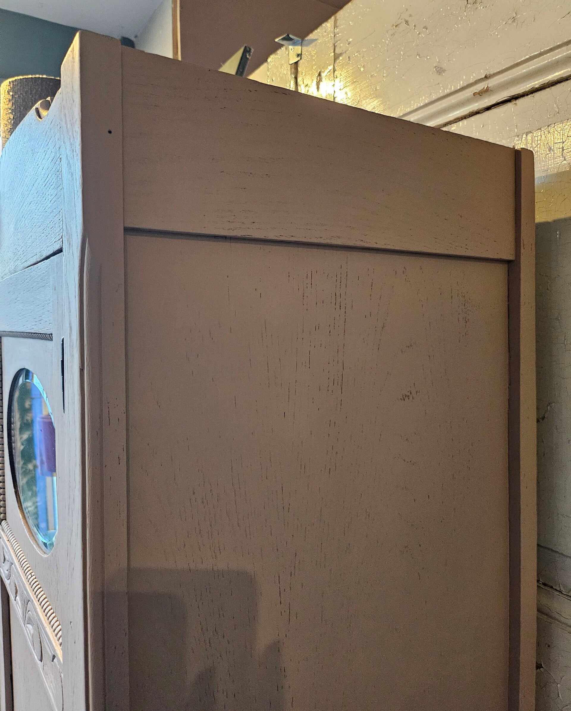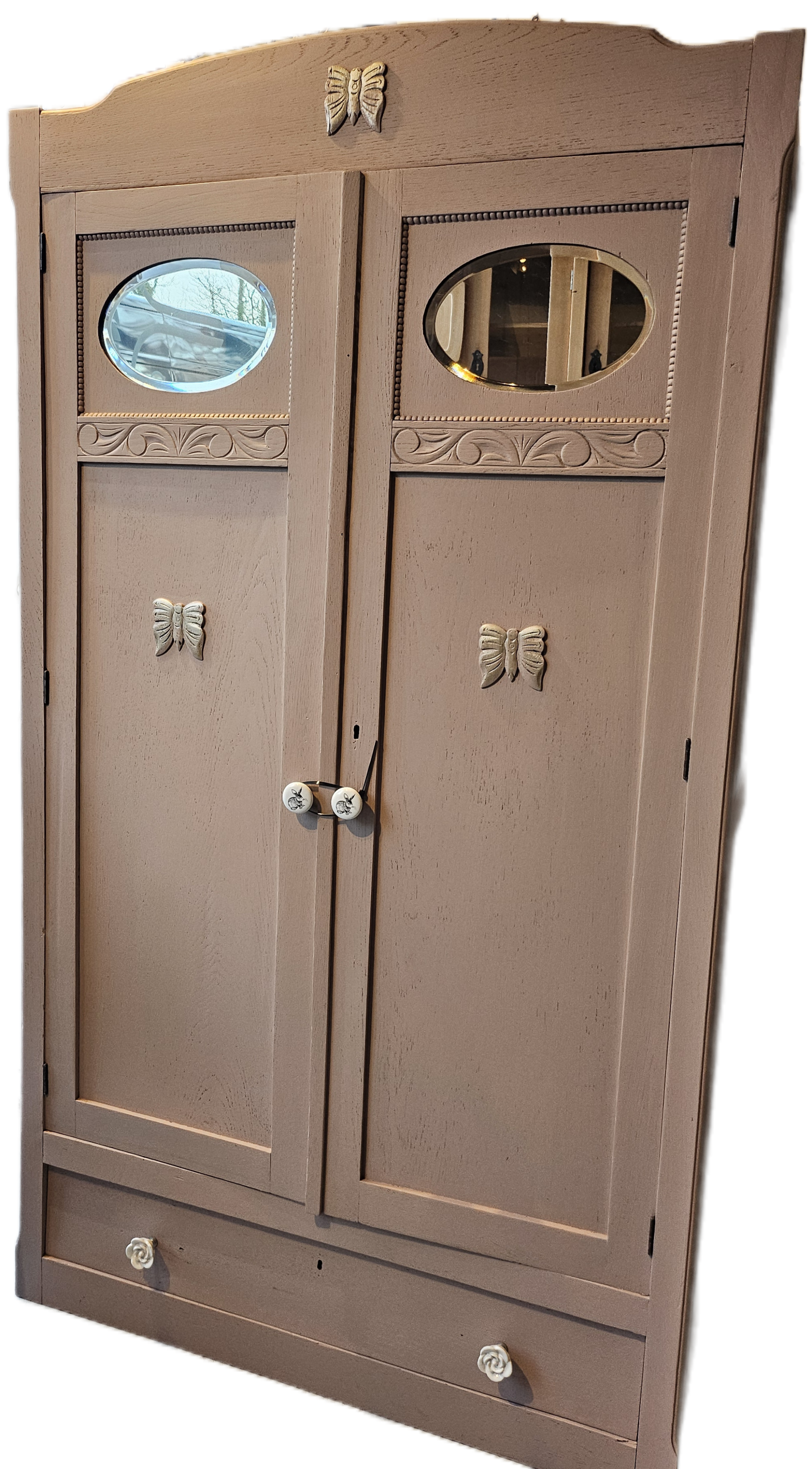 Een licht gewicht kastje geschilderd met Fusion Mineral Paint. Het is een jaren'30 kastje met wat gebruikerssporen. Orginele facet geslepen spiegeltjes. 4 nieuwe knoppen (naar eigen smaak te vervangen) deurtjes sluiten dmv magneten. Vlnders maken dit romantische kastje helemaal af. Uniek lief kastje.