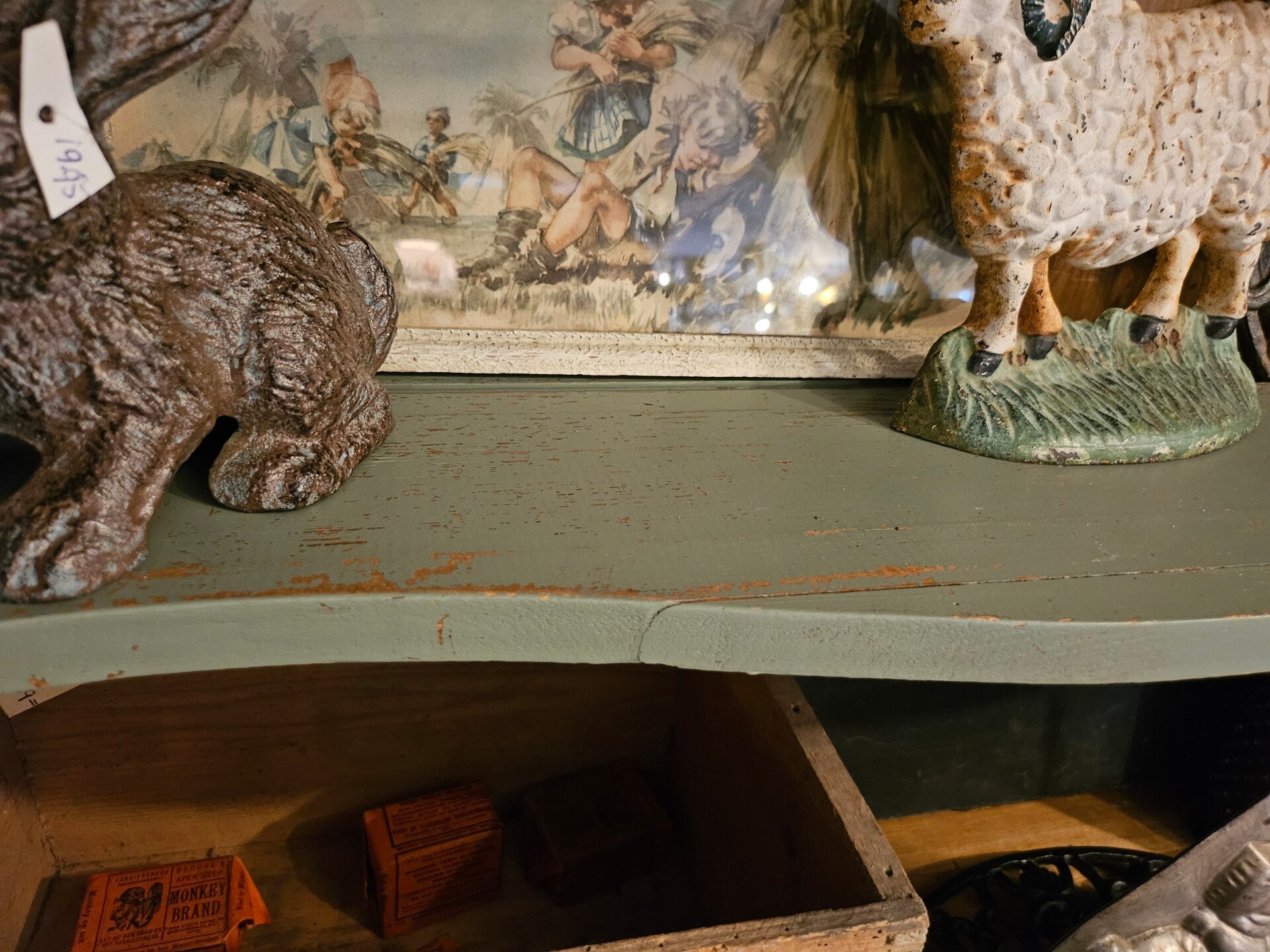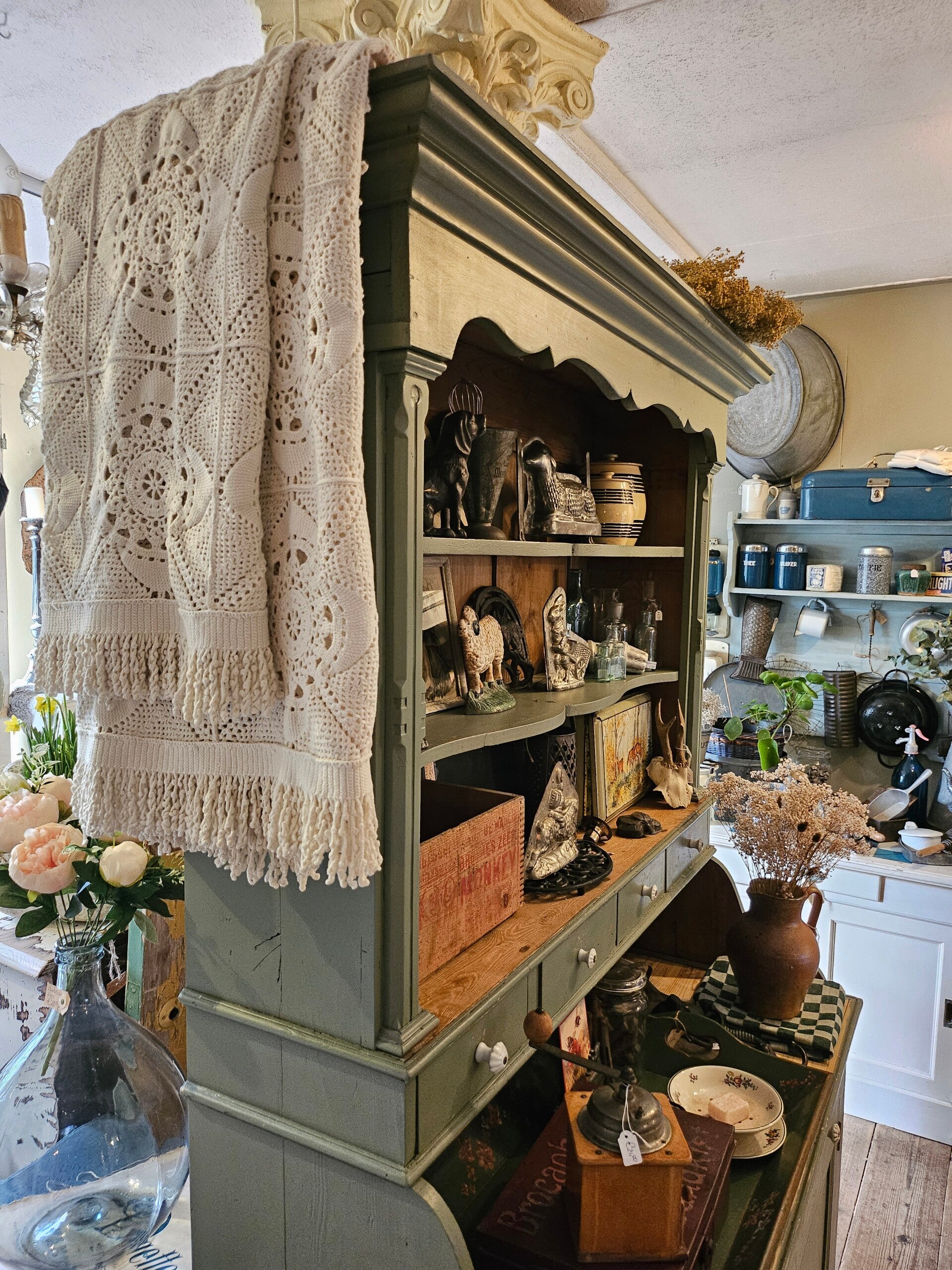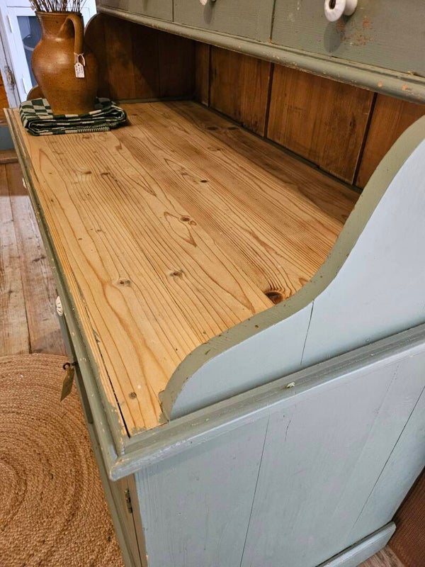 Landelijk groen is de omschrijving. De kast was orgineel in deze kleur met de nodige gebruikerssporen. Bovenblad kast is kaal en orgineel hout. De kast bied veel ruimte. De kast is in één deel. Sleutel aanwezig en functioneert. De kast heeft oude houtworm sporen en is hiervoor extra behandeld.