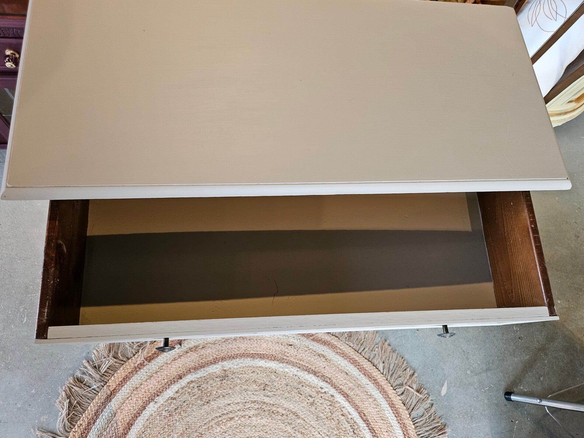 Schoenenkastje Tapestry. Enig "ladenkastje" met een verrassing achter de deur een ruim schoenrekje. Bovenste een echte lade. Kastje is geschilderd in een taupe teint met groene boventoon, Tapestry. Kastje heeft lichte gebruikerssporen, rechterachterpoot is opnieuw opgebouwd deze bleek verdwenen.