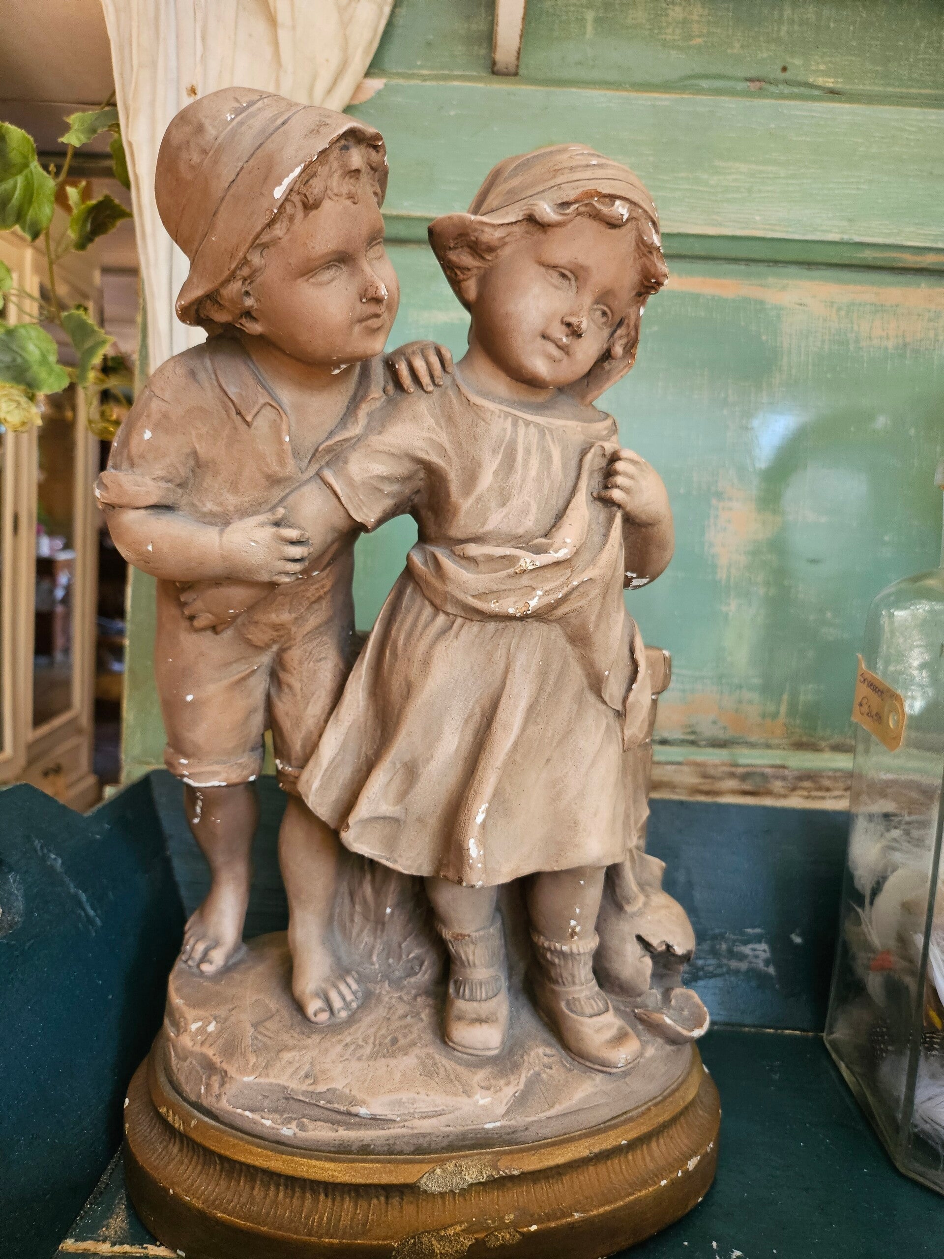 Beeld jongen & meisje. Een heerlijk lief tafereeltje doet denken aan het voorjaar. Beeld heeft wat gebruikerssporen. Beeld is van gips, aan de achterzijde een opening bedoeld als vaas.