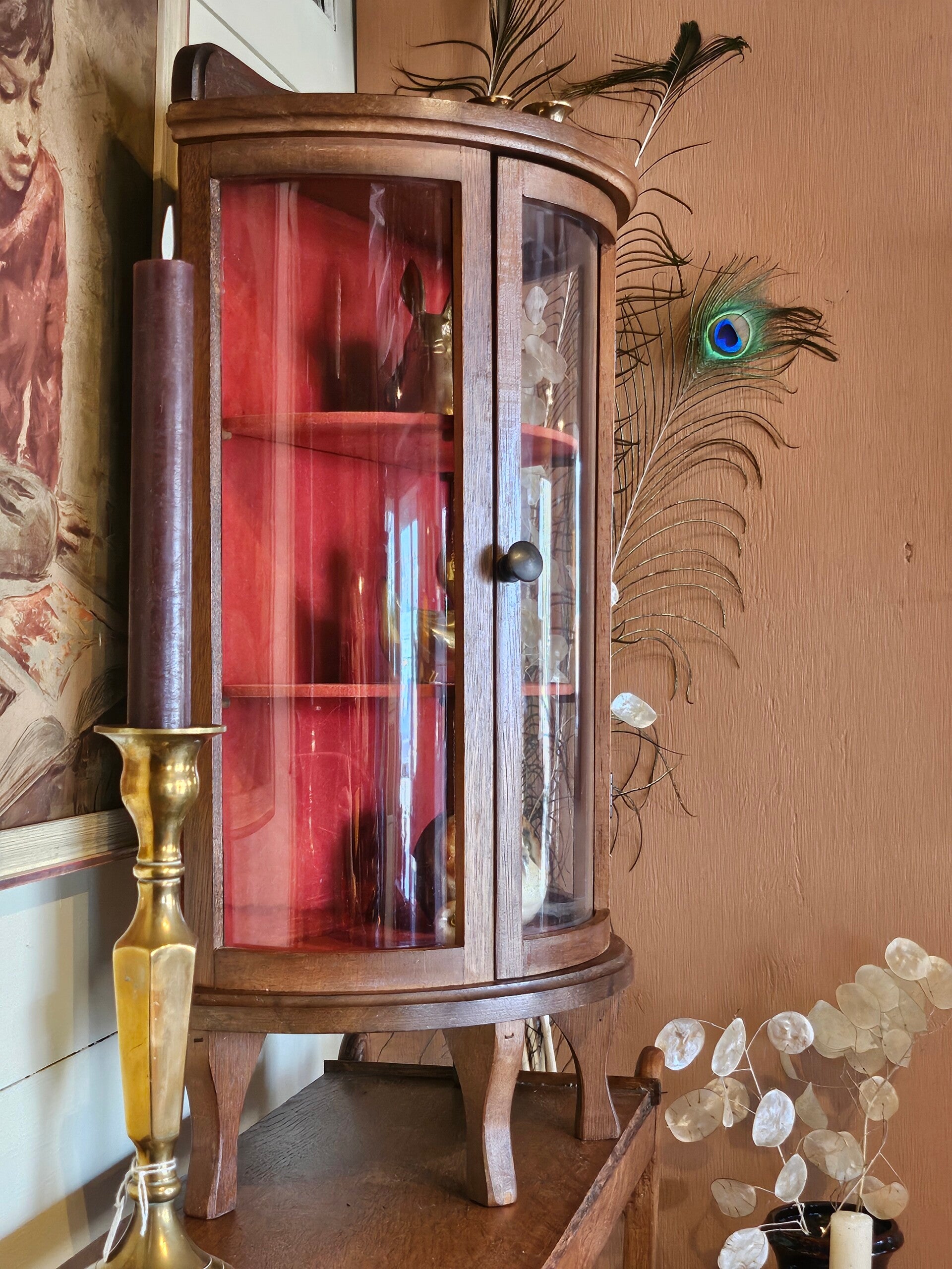 Vitrinekast, een enig lief kastje. Mogelijk is het om hem op te hangen of neer te zetten. Je mooiste parels kan je er een prachtig plekje in geven. Bekleding rood velours is orgineel. Vitrinekastje is in een nette staat.