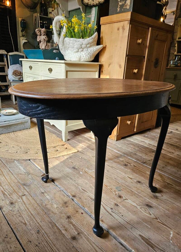Brocante tafel, een sierlijk ovaal model toch stoer door zijn doorleefde look. Zwarte poten, blad in orginele staat.