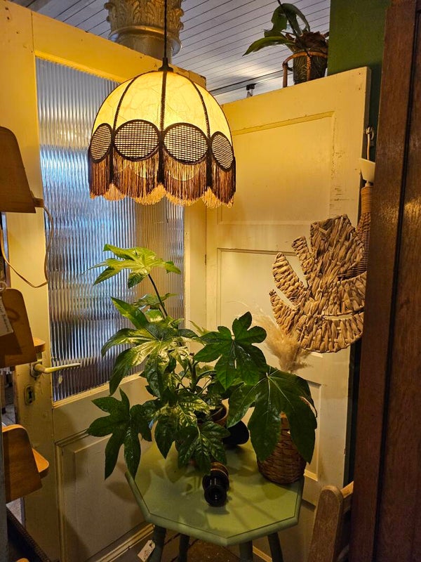 De lamp is gedeeltelijk met varkensleer gespannen, webbing en sierlijke bruine sliertjes.