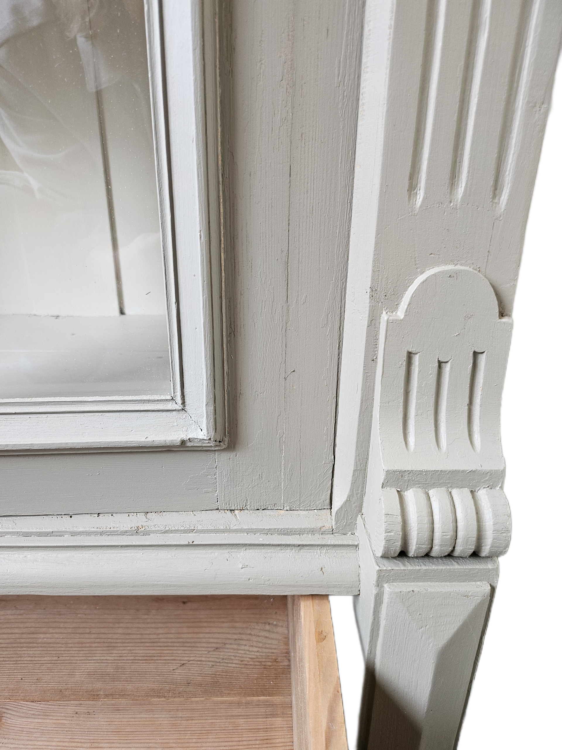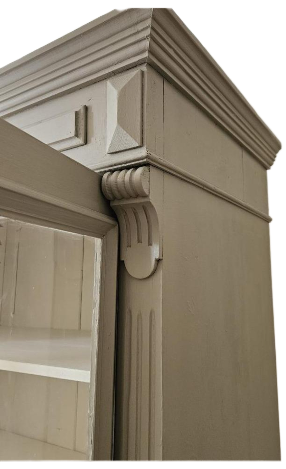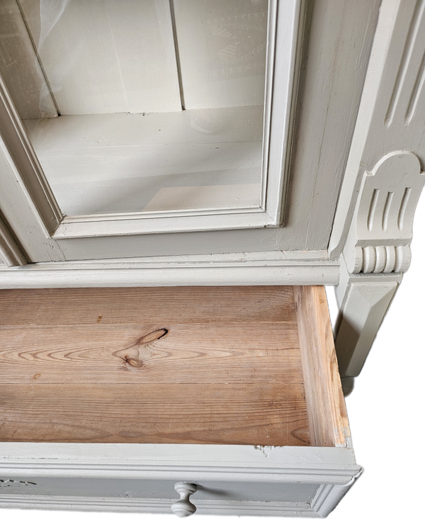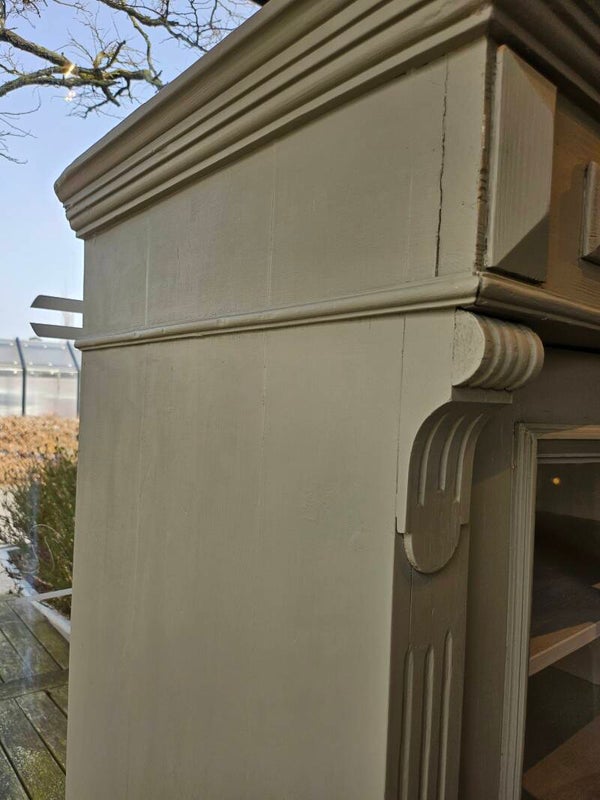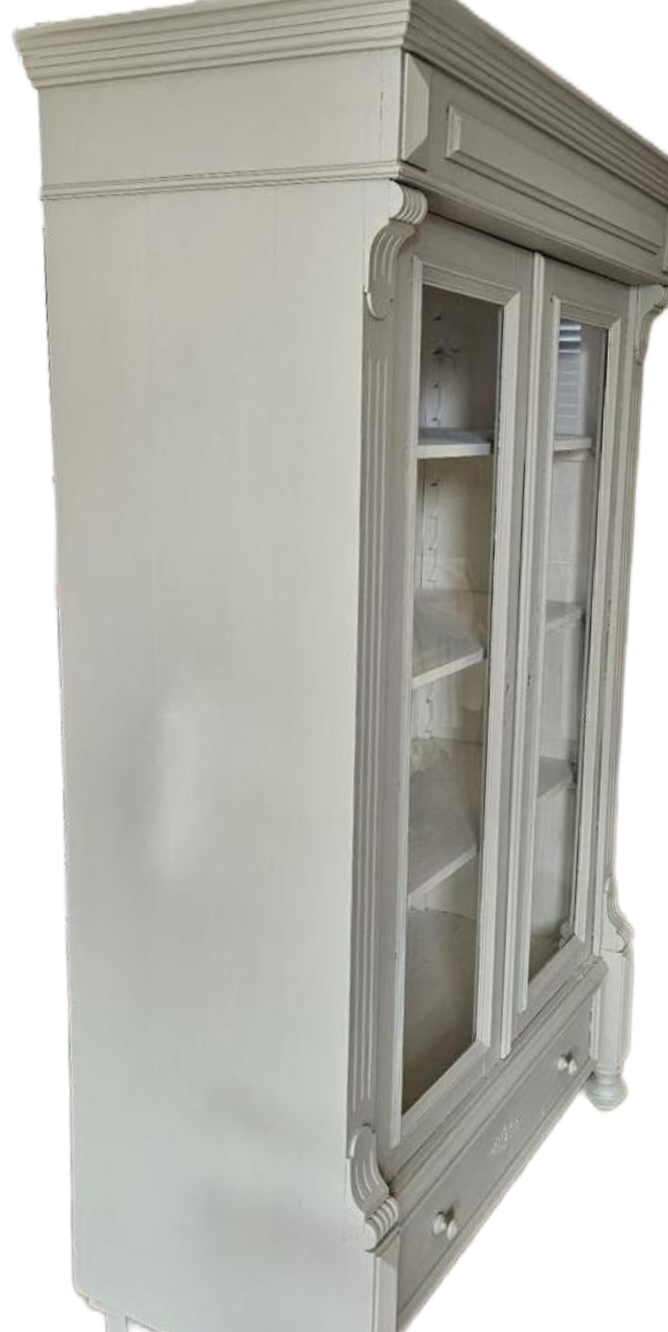 Deze landelijke vitrinekast is een stevige moot. Een mooie geleefde kast. Bied veel ruimte, en de planken kunnen naar eigen smaak in gedeeld worden.